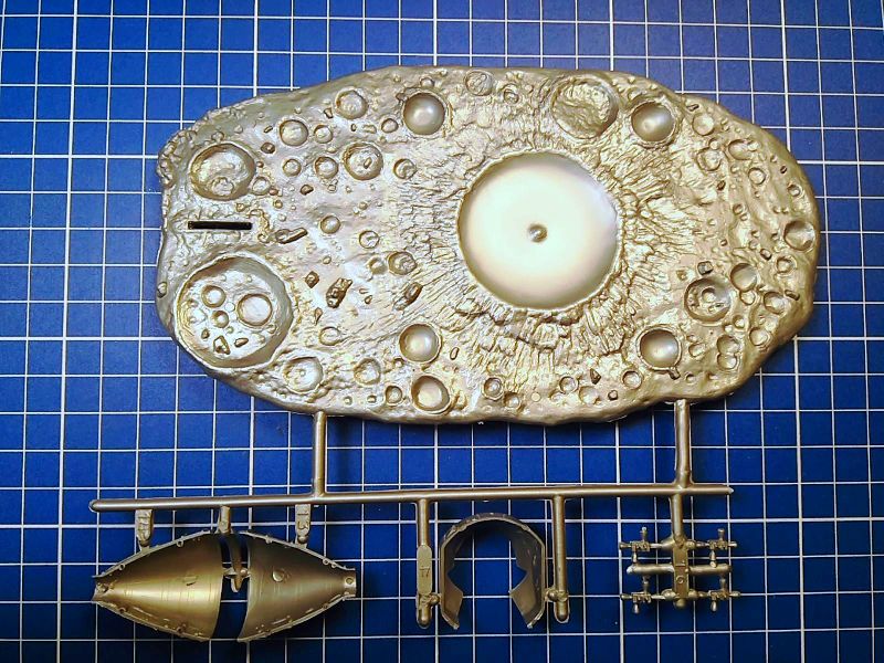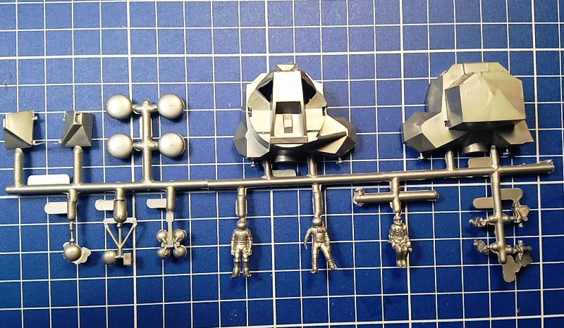Die Spritzgussteile zeigen deutlich das Alter der Formen, sie sind mit reichlich Gußgraten gesegnet. An fast allen Teilen findet man außerdem Schlieren im Plastik. Mit dem großen Ständerarm kann man die Columbia und das Servicemodul an dem Stück Mondoberfläche befestigen, das zugleich als Ständerfuß dient. Mit der Eagle auf ihrer Rückstartplattform und den zwei Astronauten auf der Oberfläche lässt sich ein recht ansprechendes Diorama herstellen.