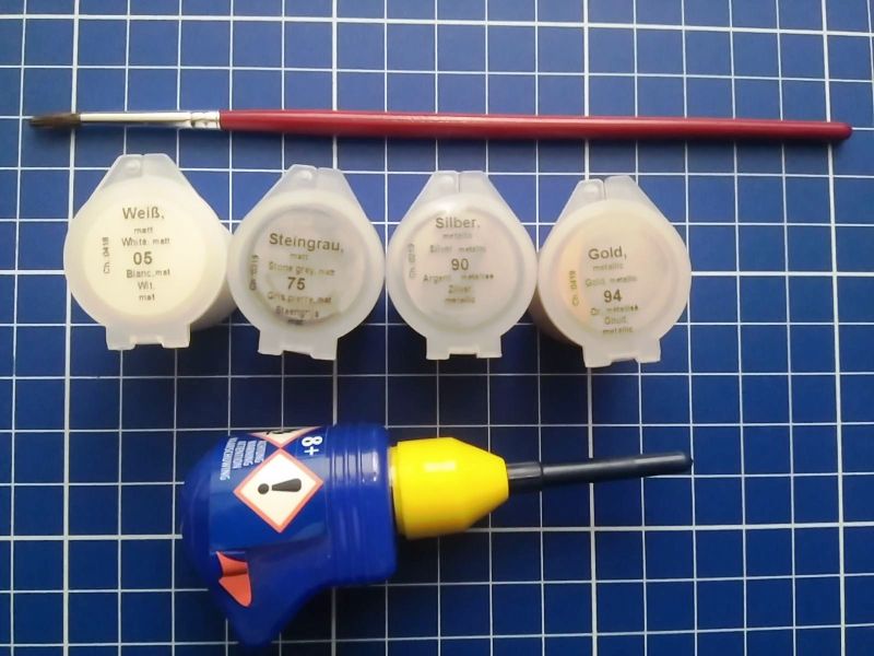 Bausatz: Der Kit kommt mit der Kategorisierung "Level 3" in einer überwiegend schwarzen, wie immer wenig stabilen Schüttbox auf den Basteltisch. Er besteht aus 53 Kunststoffteilen in Silber einschließlich 3 Figuren, einem großen Stück Acetatfolie für die Fenster, einem Stück Goldfolie und einem kleinen Decalbogen. Für den Zusammenbau und die Bemalung liegen außerdem eine kleine Flasche Revell Contacta Plastikkleber, vier kleine Becher mit Acrylfarben und ein recht struppiger Pinsel Stärke 2 bei.