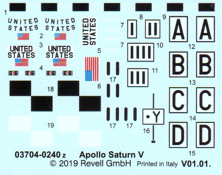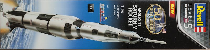 Bausatz: Den 50. Jahrestag der ersten bemannten Mondlandung nimmt sich Revell zum Anlass, eine Reihe von klassischen Raumfahrtbausätzen der 1960er/70er Jahre neu aufzulegen. Der Bausatz für die Saturn V datiert zurück in das Jahr 1969. Das merkt man auch. Die Detaillierung ist teils etwas grob, an einigen Stellen findet sich Fischhaut. Dennoch lässt sich der aus dem Bausatz ein beeindruckendes Modell von über einem Meter Größe erstellen. Den Lern- und Spielwert erhöht, dass sich die Stufen trennen lassen und jede mit eigenem Triebwerksatz ausgerüstet ist.