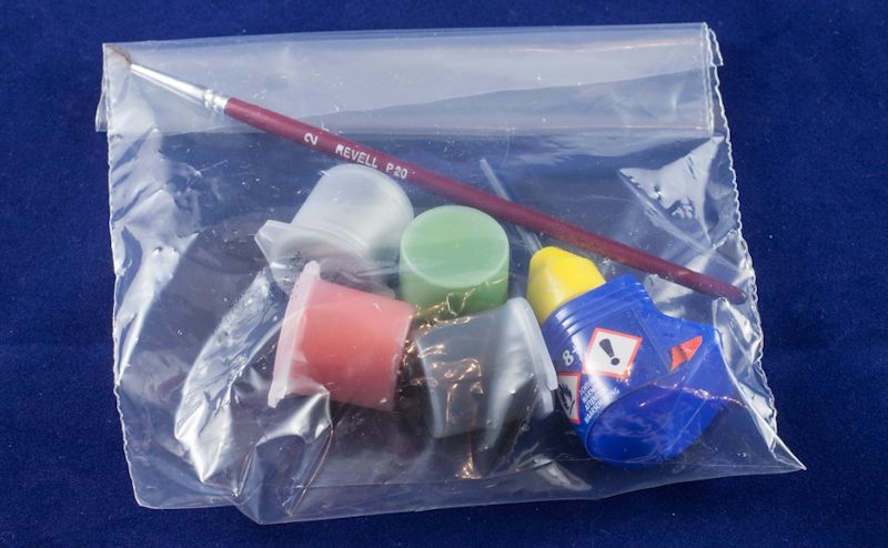Bemalung: Die Decals ergänzen die vorbedruckten Raketensegmente. Für Einsteiger liegen kleine Töpfchen mit den vier wichtigsten Farben, einen Pinsel und Kleber bei.