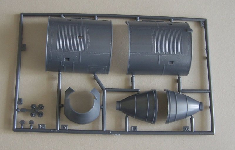 Die Teile: Dieser Modellbausatz ist eine Wiederauflage des Heller-Models von ca. 1970. Es handelt sich um einen sauber erstellten Spritzguss Bausatz aus stabilem, silbernen Kunststoff. Die Teile sind mit schönen, erhabenen Strukturen versehen. Ansatzweise ist das Cockpit dargestellt. Die Wiedereintrittskapsel und das Versorgungsmodul können getrennt gebaut werden, sie werden dann zusammengesteckt um das gesamte Raumschiff abzubilden. Das funktioniert prima, wie der Autor aus Kindertagen zu berichten weiß. Ergänzt wird der Bausatz durch die nötigen Decals und eine verständliche Bauanleitung.