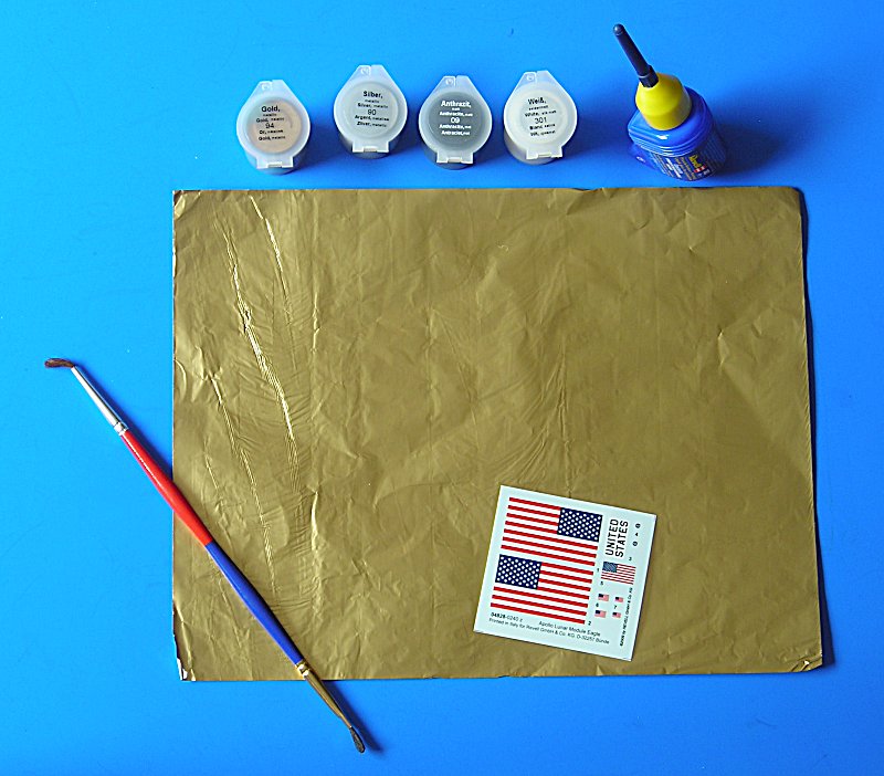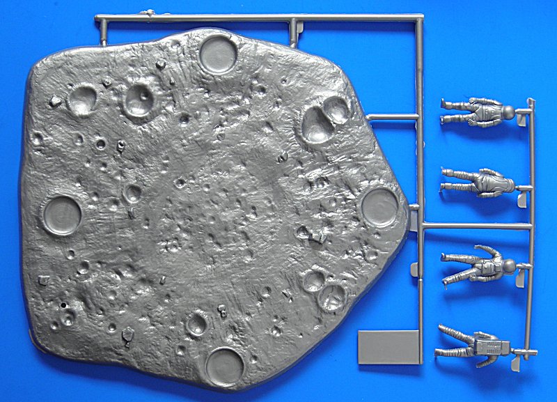 Neben dem Landemodul gibt es auch eine kleine Mondlandschaft und zwei Sternenfahrer. Dazu Goldfolie, Kleber, einige Farben und einen Pinsel, also ein komplettes Packet für den Einsteiger. Ich weiß allerdings nicht wie gut sich dieses Modell bauen lässt, einige der älteren Revell/Monogram-Bausätze sind da duchaus fordernd.