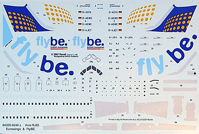 Markierungen: Der Decalbogen ist ja bei allen neuen Airlinermodellen(Wiederauflagen) von Revell immer das absolute Highlite, wenn sie aus der Designschmiede von DACO stammen. Auch bei dem Avro RJ 85 trifft das wieder bedingungslos zu. Der 22 x 15 cm grosse Bogen bietet ca. 150 Elemente für 8 darstellbare Maschinen von Eurowings und Flybe. Dabei sind für die 4 deutschen Maschine die Kennungen schon fertig einteilig. Weiterhin sind sämtliche Naturmetalloberflächen für die Anti-Iceflächen als Abziehbild vorhanden, umständliches Abkleben oder Detailbemalen entfällt. Die beiden "Glaubensrichtungen" beim Airlinerbau werden auch bedient, Silverframes bzw. ganze Fenster für die geschlossene Fenstervariante liegen bei. Da bei der Flybevariante die blaue Farbe angemischt wurden muss, befindet sich eine Fläche zum Kontrollieren ebenfalls auf dem Bogen.