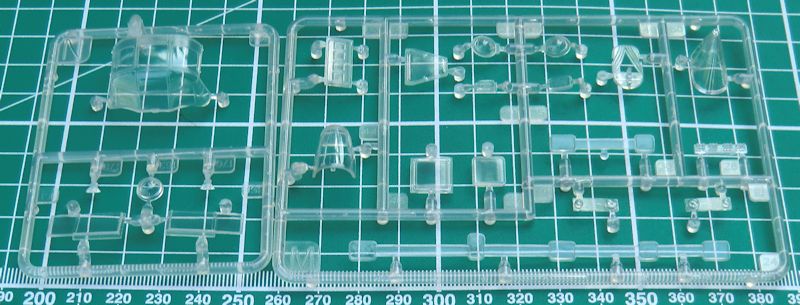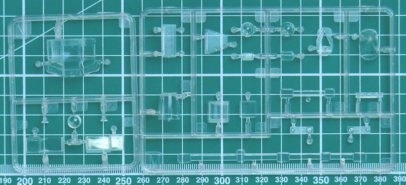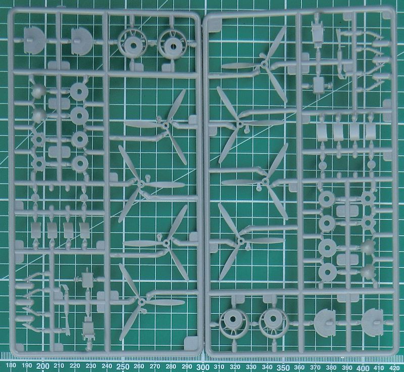 Die Positionsleuchten werden mittels Klarsichtteilen dargestellt. Der verkleinerte Waffenschacht kann alternativ offen gelassen waren. Er kann mit Abwurfwaffen bestückt werden. Leider haben die Klappen Innen keine Details. Ansonsten bleibt er auch leer. Die Abwehrwaffen sind relativ einfach aber ordentlich. Alle acht Luftschrauben bestehen aus jeweils einem Stück. Die Klarsichteile sind schön dünn.