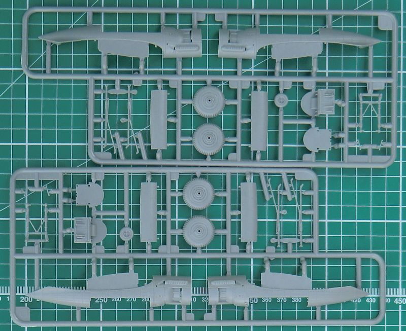 Es gibt bei Revell zwölf graue Spritzlinge mit 177 Einzelteilen, einen klarer Spritzling mit 22 Teilen, einen großer Decalbogen, eine mehrfarbige Bamalungsanleitung und die übersichtliche Bauanleitung. Die Abspritzung der Bauteile ist voll auf der Höhe der Zeit. Die Strukturen sind feiner als beim Airfix-Bausatz. Leider gibt es in der Produktion einige Qualitätsmängel. Es gibt leider ein paar Sinkstellen Diese befinden sich "nur" auf der Oberseite der Tragfläche. Falls man diese beheben möchte, dann muss man richtig Zeit einplanen damit hinterher nichts mehr zu sehen ist. Da diese Sinkstellen beim Testshot nicht vorhanden waren, sollte man einfach die Spritzgussmaschine optimal einstellen und dann die Qualität prüfen! Ansonsten ist der Revell-Bausatz so aufgeteilt, dass noch andere Versionen möglich wären. Mit Sicherheit kommt von Revell noch die normale MR. 2 und dann…???? Toll wären beide Richtungen. Die MR. 1 gab es noch nie und die MR. 3 mit Bugfahrwerk bekanntlich von Frog.