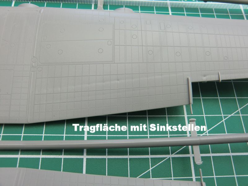 Für die bessere Stabilität der Tragfläche werden zwei stabile Holme eingezogen. Die Landeklappen können alternativ ausgefahren angeklebt werden. Für die Ruder gibt es Teile mit scharfen Hinterkanten. Da hat Revell eine gute Lösung gefunden. Leider gilt das nicht für die Querruder. Die Fahrwerksschächte sind ordentlich mittels vorbildgerechter Strukturen detailliert. Hier hilft zusätzlich eine detaillierte Bemalung. Die Fahrwerksbeine sind sehr gelungen und das Reifenprofil gefällt mir. Das Gleiche gilt für das Heckfahrwerk.