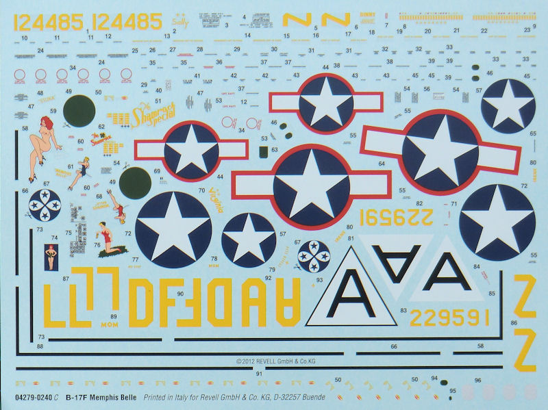 Bausatz: Von dem schön detaillierten Revell-B-17-Bausatz erschien nun auch eine F-Version. Natürlich musste es die "Memphis Belle" sein. In der unpraktischen wabbeligen Schüttbox befinden sich gut verpackt neun hellgraue Spritzlinge mit 206 Teilen, ein Klarsichtrahmen mit 29 Teilen, ein Decalbogen und die sehr gute übersichtliche Bauanleitung. Ein paar Teile sind für andere Versionen bestimmt und wandern in die Restekiste.