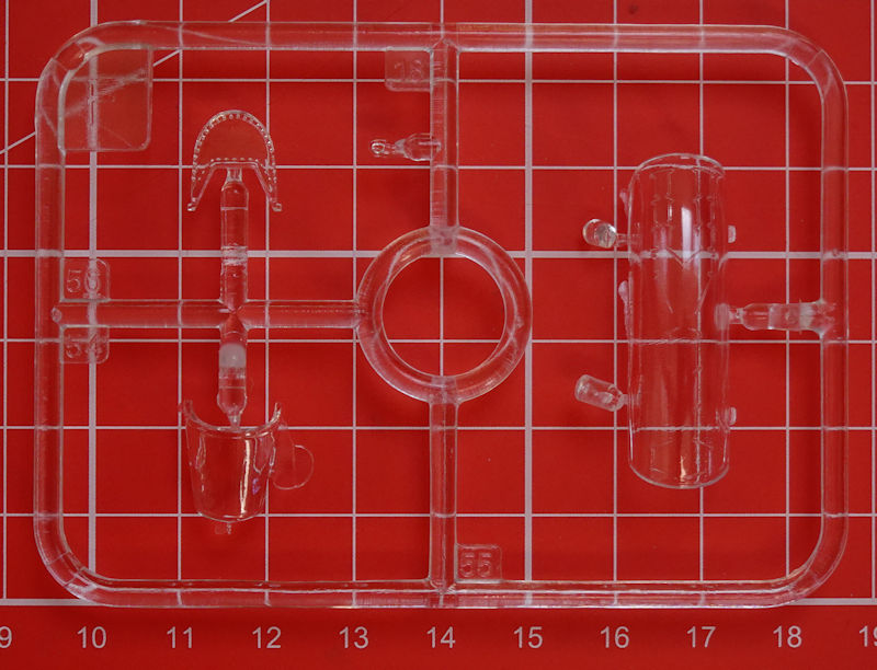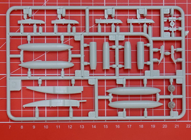Bausatz: Hierbei handelt es sich um eine 2020er Neuheit. Dabei wurde der Formenneuheit aus 2015 ein neuer Spritzling hinzugefügt. In einer attraktiven aber unpraktischen Schüttbox befinden sich gut verpackt eine übersichtliche mehrfarbige Bau- und Bemalungsanleitung, vier graue Spritzlinge mit 86 Teilen, einen Rahmen mit vier Klarsichtteilen und einen Decalbogen. Es gibt schöne feine versenkte Strukturen. Die graue Farbe der Spritzgussteile soll die Farbgebung erleichtern. Beim Level 3-Bausatz wären aber auch schwarze Spritzgussteile eine gute Option für Einsteiger gewesen.