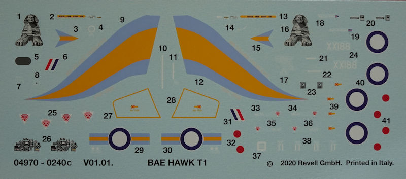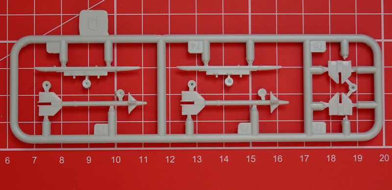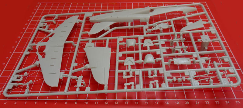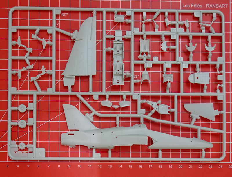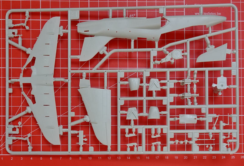 Die Spritzgussbauteile haben eine leicht matte Oberfläche. Insgesamt überwiegt bei diesen neuen Bausatz der positive Eindruck auf jeden Fall. Neu sind die beiden Spritzlinge für die Bewaffnung und Zusatztanks. Leider hat man hier bei Rumpf und Tragfläche einen konventionellen Aufbau. Das Cockpit sieht gut aus und hier kann Revell gegenüber Airfix-Hawk bisschen punkten. Die Instrumentenbretter haben Strukturen und können noch mit Decals versehen werden. Die Schleudersitze sind recht ordentlich. Allerdings fehlen hier noch Gurte. Diese hätten sicherlich auf dem kleinen Decalbogen noch einen Platz gefunden.