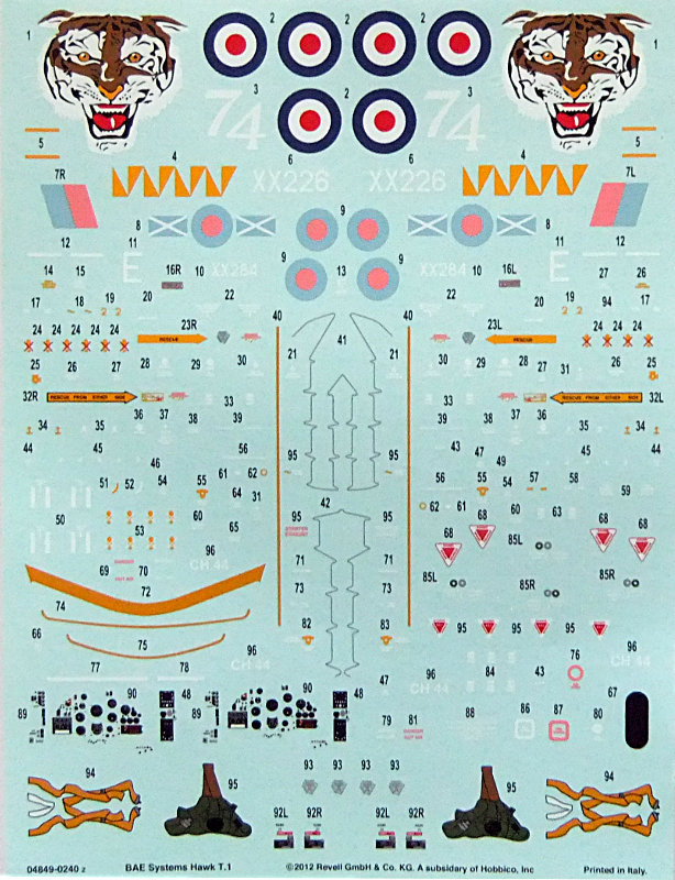 Der große Decalbogen sieht zwei Maschinen der RAF vor: Eine Schwarze Hawk vom Tigermeet Einsatz 1997 und eine Variante im Grau-InGrau Anstrich des 2. taktischen Waffenverbandes der RAF in Chivenor 1992.