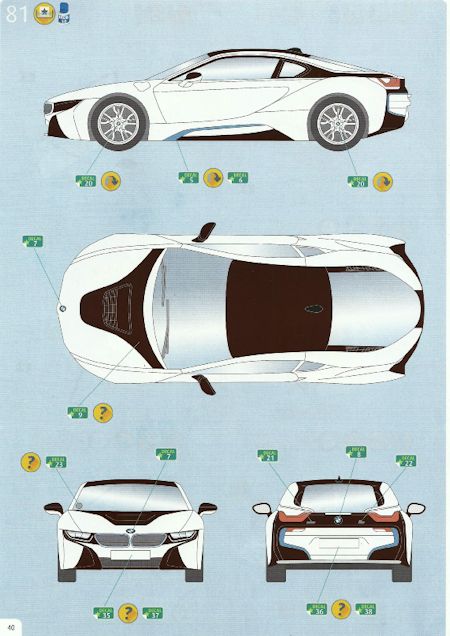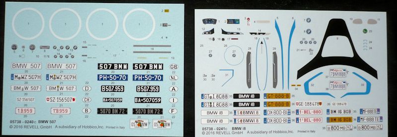 Bemalung: Durch den Bastelspaß führt eine vierzigseitige, leicht verständliche Bauanleitung mit 56 Bauabschnitten für den 507 und 81 für den i8. Das Level 4 weist auf den erfahrenen Modellbauer hin. Die Bemalungsanleitung bezieht sich auf das Farbensortiment von Revell. Die beiden Decalbögen sind sauber und randscharf gedruckt, d.h. von hervorragender Qualität. Sie beinhalten zu den fahrzeugspezifischen Decals zusätzlich eine Vielzahl von internationalen Kennzeichen.