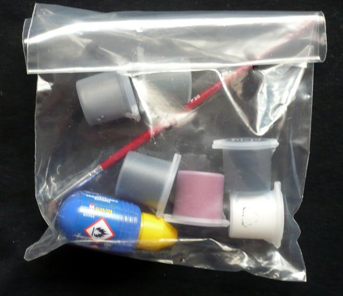 Den gutgemeinten beiliegenden Beutel mit Kleber, Farbtöpfchen und Pinsel möchte ich nicht vergessen, obwohl ich der Meinung bin, dass hier doch professioneller an die Lackierung rangegangen werden sollte.