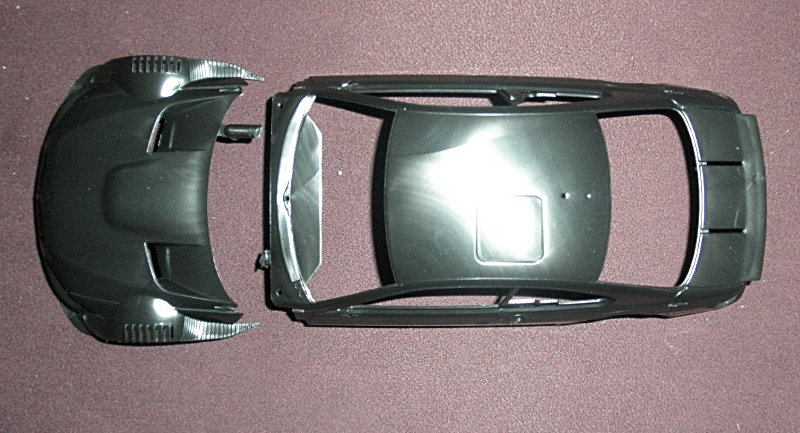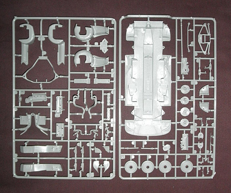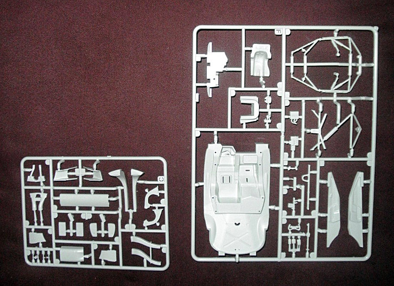 Die Karosserie und die zu öffnende Motorhaube sind schon in schwarzem Plastik gespritzt, was auch es auch dem Anfänger erlaubt, das Modell ohne Lackierung zu bauen. Zwei weitere Spritzrahmen in weißem Plastik für den Innenraum, inklusive Überrollkäfig, sowie ein Spritzrahmen in grauem Plastik, der den Unterboden, die Radkästen und weitere Teile enthält.