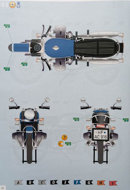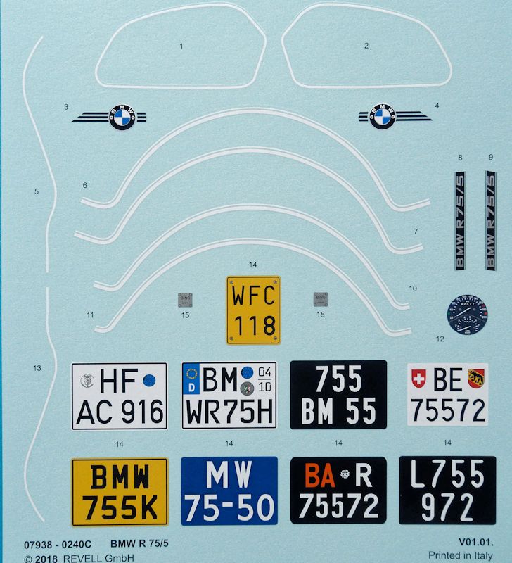 Der Decalbogen besitzt insgesamt neun Kennzeichen verschiedener Länder wie z.B. England, Frankreich, Schweiz. Von der deutschen Kennzeichnung sind sogar zwei vorhanden, wovon eines noch die alte Ausführung, ohne Eurosymbol, und die andere eine H-Kennzeichnung, nach heutigem Stand darstellt. Besonders sind hier die Decals für die weißen Streifen am Tank und Schutzblechen zu erwähnen. Diese wurden am Original seinerzeit per Hand auf die Teile gemalt und nicht maschinell. Das Revell hier mitgedacht hat und dem Modellbauer eine Menge Mühe erspart, indem diese Linien hier beigelegt sind, ist wirklich lobenswert.
