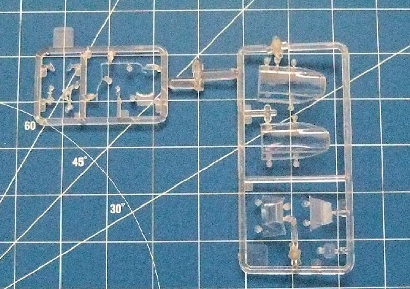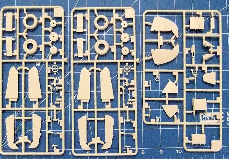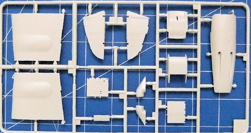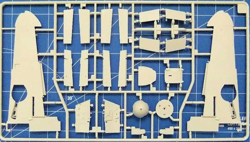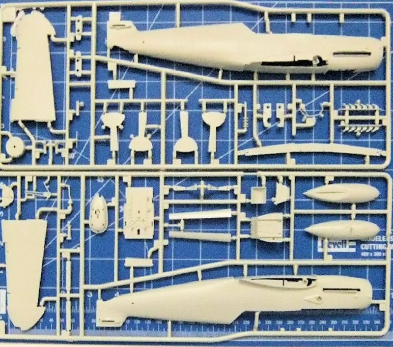 Auf die vorgegebene Möglichkeit diese beweglich zu halten, sollte aber verzichtet werden. Auch für dieses Modell stehen zwei verschiedene Ausführungen der Erla-Kabinenhaube zur Verfügung. Details, sowie die Gravuren sind voll auf Höhe der Zeit und insbesondere die Sicken am Leitwerk geben unserer Messerschmitt noch ein wenig vom Flair der 40er Jahre Flugzeugkonstruktionen. Für die äußere Ausstattung des Modells hat Revell auch bei dieser Variante nur den Zusatztank vorgesehen. Zu beachten ist, dass sich an den langen Beulen der oberen Tragflächen Einsinkstellen befinden. Es ist genau der Bereich, an dem sich innen die runden Einfassungen der Fahrwerksschächte befinden.