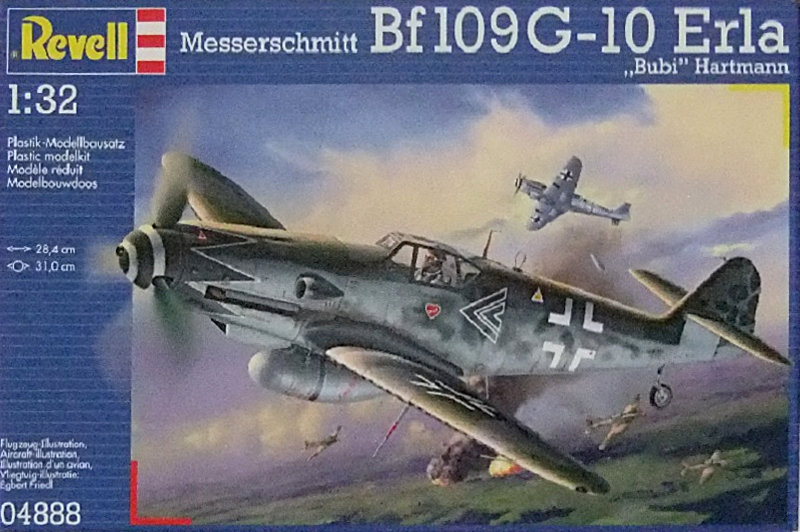 Vorbild: Die Bf 109 G-10 war die letzte und auch schnellste Ausführung der sogenannten Gustav-Reihe und stellte den Übergang zur geplanten, aber noch nicht produktionsreifen K Reihe dar. Im Rahmen des "Jägernotprogramm" wurde beschlossen, die G-6 für den Einbau des Daimler Benz DB-605 D Motors zu modifizieren. Die Motorhaube wurde verändert um den größeren Motor unterzubringen, womit die markanten seitlichen Beulen entfielen, die fast schon ein Markenzeichen der Gustav-Jäger waren. Um dem gestiegenen Startgewicht Genüge zu tun, erhielt das Flugzeug breitere Fahrwerksräder. Um diese unterzubringen wurden die Tragflächen mittels langgezogener Beulen verstärkt. Die Bewaffnung blieb gleich. Etwa 2000 Maschinen dieser Serie wurden gebaut.