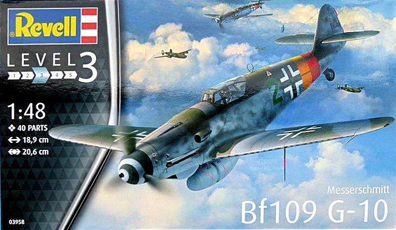 Bausatz: Mit der Bf 109G-10 im Maßstab 1:48 hat Revell wieder einen Formenoldie auf den Markt gebracht. Hat dieser doch schon über 30 Jahre auf dem Buckel. Aber trotzdem machen die Oberflächenstrukturen immer noch gute Figur was die Details betrifft. Mit der von Revell einführten Levelangabe weiß der Modellbauer welcher Schwierigkeitsgrad ihn erwartet. Mit Level 3 sollte auch der Modellbauanfänger gut zurechtkommen.