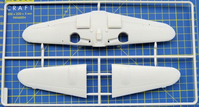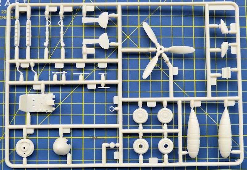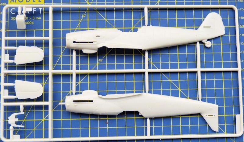 In dem mittelgroßen Schüttkarton mit attraktiven Motivbild, befinden sich 3 hellgraue Spritzlinge und ein kleiner aus Klarsichtmaterial mit Erla-Haube und Revi. Insgesamt 40 Teile gilt es zu verbauen. Die versenkten Oberflächenstrukturen können aufgrund des Alters der Bausatzform nicht mehr mit neueren Modellen mithalten gehen hier aber vollkommen in Ordnung. Leider liegen die Klappen nicht separat bei und sind fest mit dem Modell verbunden. Hier nimmt der Modellbauprofi die Modellbausäge zur Hand. Das Cockpit Ist leider sehr einfach gehalten. Die Sitzgurte sollten auf jedenfall hinzugefügt werden. Das Fahrgestell ist sehr gut Detailliert. Auch hier reicht ein hinzufügen der Bremskabel per Kupferlitze.