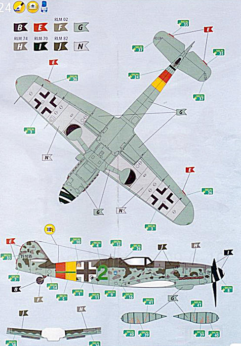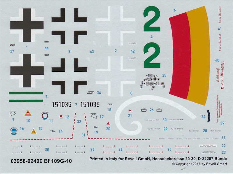 Bemalungsvarianten: Revell bezieht sich bei den Farbangaben auf das eigene Farbprogramm. Hier kann zwischen Email und Aqua Color auf Acrylbasis gewählt werden. Man kann aber auch RLM Farben verwenden. Dem Modell liegt nur eine äußerst attraktive Decalvariante bei.