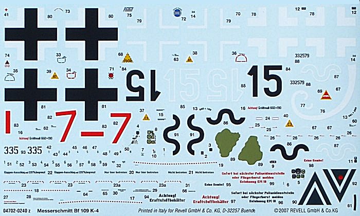 Bei den Bemalungshinweisen werden immerhin die RLM-Farbtöne angegeben. Für alle, die die fertigen Farben zu Hause haben, entfällt das mühsame Suchen der Originalfarben. Von der elenden Mischerei ohne Ziel wollen wir hier lieber nicht reden, die dann erspart bleibt. Die Decals sind recht ordentlich gedruckt, obwohl die übermalten Vier (Decal) einen recht eigenwilligen Farbton haben. Schön sind auch die Maskenvorlagen für die übermalten Winkel bei der 15.