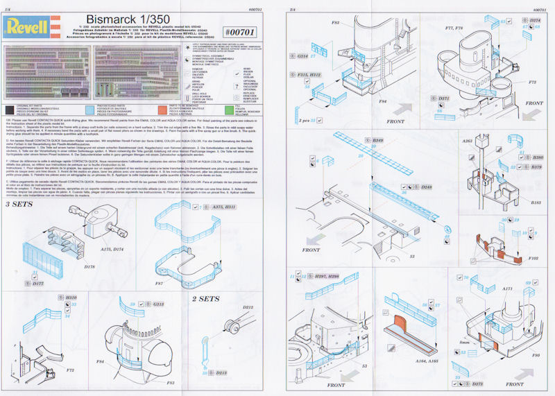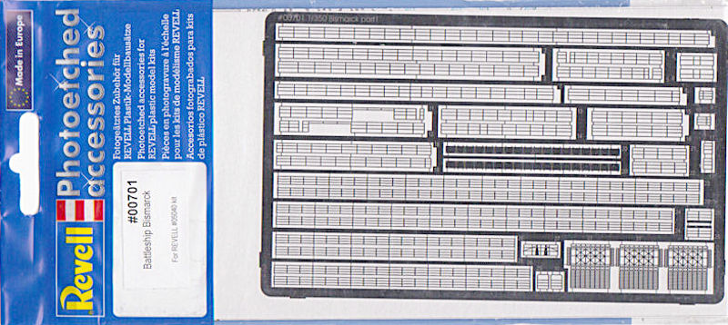 Für den schon länger auf dem Markt befindlichen Bausatz Bausatz der Bismarck in 1/350 hat Revell jetzt ein Set Fotoätzteile herausgebracht. Es enthält Teile für die Reling, Treppen mit Geländer und Teile für die Funkmessanlage. Das Set unterscheidet sich augenscheinlich von dem für die Tirpitz gedachten. Die Unterschiede der beiden Bausätze wurden berücksichtigt.