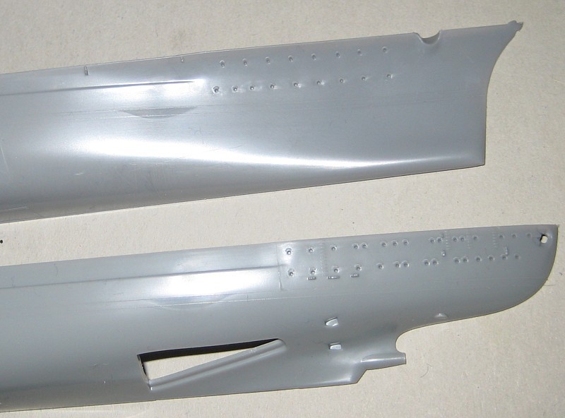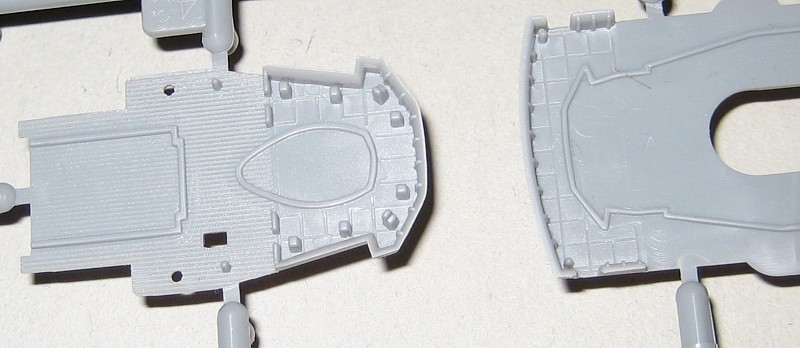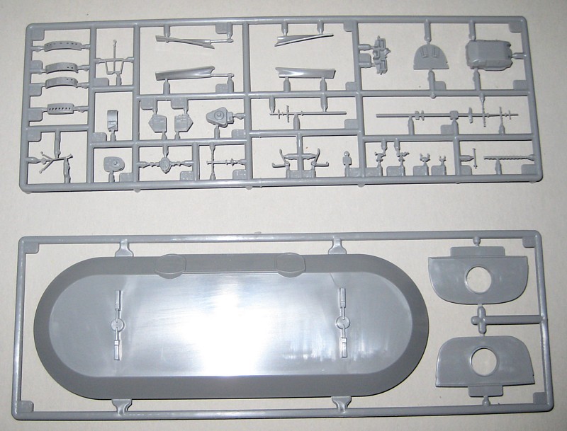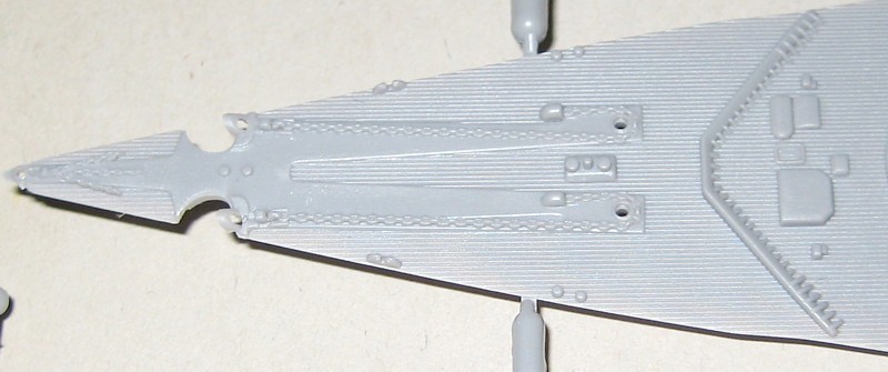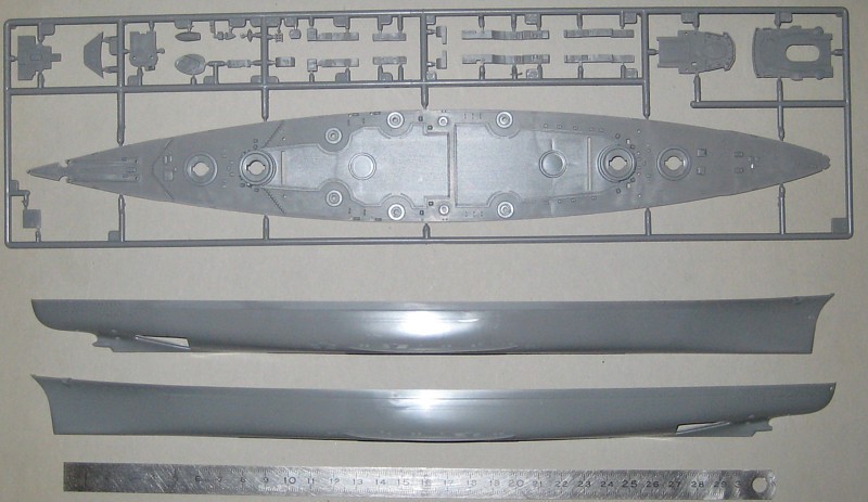Der Bausatz ist als Vollrumpfmodell ausgeführt, der auch Spanten zur Verstärkung enthält. Die oft geäußerte Kritik, dass eine Wasserlinienoption in 1/700 gleich vorgesehen sein sollte, kann ich nicht ganz nachvollziehen. Das Unterwasserschiff abzutrennen ist eine einfache Laubsägearbeit mit anschließendem Planschleifen und dauert nicht länger als eine halbe Stunde. Man muss nicht mal die Wasserlinie anzeichnen, da der breite Wasserpass als feine erhabene Linien dargestellt ist. Im übrigen hängt die Höhe der Trennlinie auch von der gewählten Methode der Wasserdarstellung und der Lage des Schiffes im Wasser ab. Trennungen genau an der Konstruktionswasserlinie, wie es viele Hersteller machen, verursachen oft Modelle mit unnatürlichem Tiefgang.