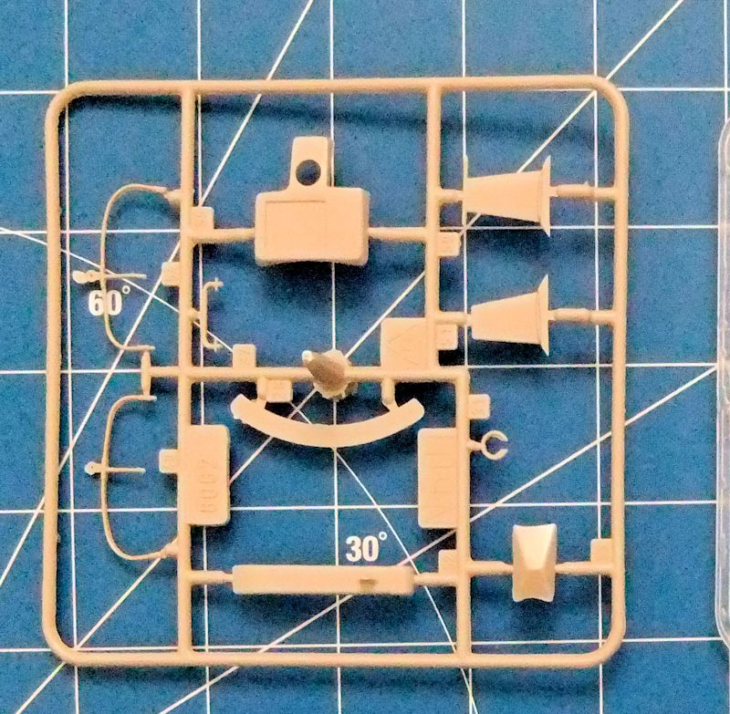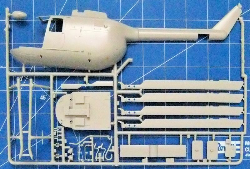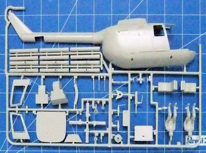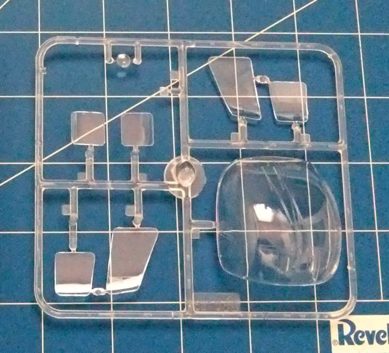 Der Bereich am Rotor ist ausreichend detailliert, nur die beiden äußeren gekrümmten Abgasrohre der Triebwerke des "Helis" sollten aufgebohrt werden. Einige der kleinen Teile, wie die Schwertantennen, der Schutzrahmen vor der oberen Öffnung zu der Rotormechanik und die Visieroptik stammen übrigens aus revelleigener Produktion und waren am Originalbausatz nicht vorhanden. Die Klarsichtteile sind schlierenfrei und besonders die große Bugkabine lässt einen verzugsfreien Durchblick zu. Einzig mit den aufgeprägten Scheibenwischern auf der großen vorderen Kanzel muss man leben. Es sei denn, der Modellbauer ist ein Meister im schleifen und polieren.