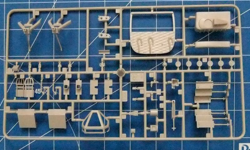 Noch eine paar Sätze zu der Detaillierung: Man darf natürlich von einem Bausatz dieses Alters keine Wunder erwarten. Aber die beiden Rumpfhälften verfügen über eine durchaus annehmbare Oberflächenstruktur. Die hinteren Schiebetüren sind allerdings geschlossen in den Rumpf eingebunden. Das Cockpit kommt dem Original recht nahe, lässt aber noch genug Spielraum für Eigen initiative, z.B. Gurte und Nachdetaillierung der Türen im inneren Bereich. Diese sind auch für ein geöffnetes Cockpit vorgesehen.