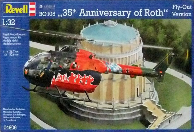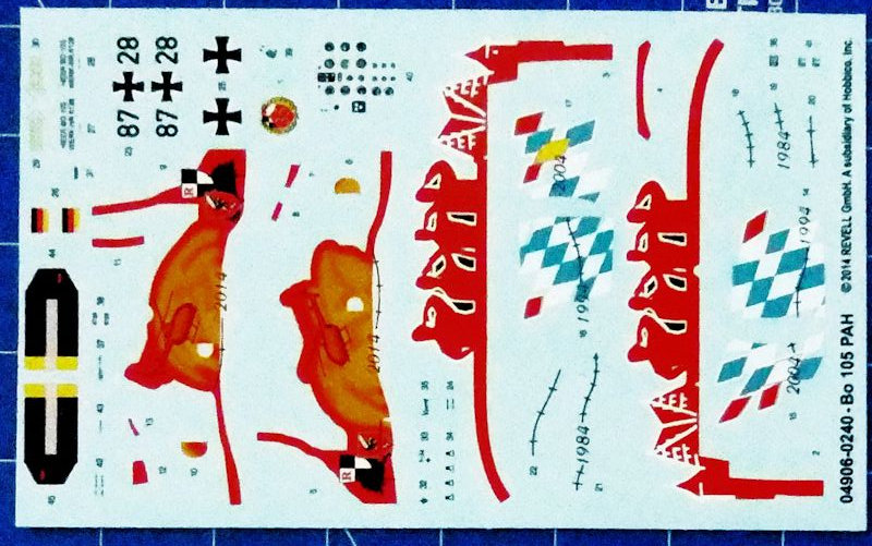 Bemalungsvarianten: Wie schon erwähnt, ist nur eine Gestaltungsvariante vorgesehen: Die "fly out" BO 105 des Kampfhubschrauber- Regimentes 26 (KHR 26), welches bis Juni 2014 im mittelfränkischen Roth beheimatet war. Neben der bayrischen Flagge ziert eine Zeitlinie nebst salutierenden Soldaten den Rumpf der Maschine. Auch Teile der Stadtkulissen von Roth und eine Hornisse, das Wappen der Einheit, sind auf dem Hubschrauber platziert. Diese Elemente befinden sich auch auf dem kleinen Decalbogen des Bausatzes.