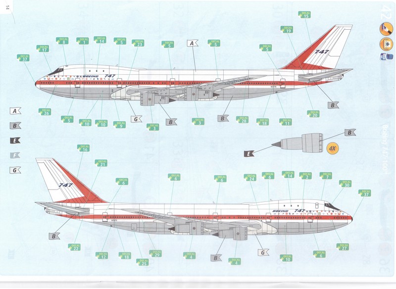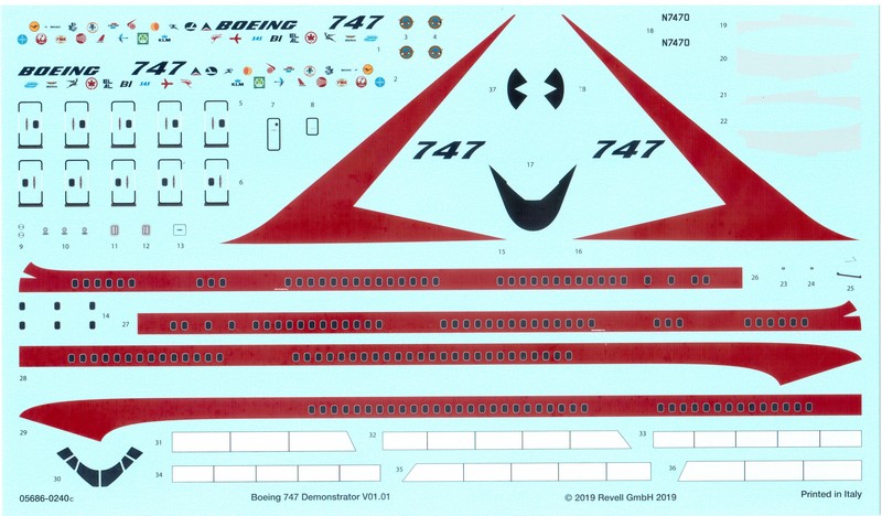 Highlight dieses Jubiläumsbausatzes ist sicherlich der Abziehbilderbogen. Er enthält alle Motive für den ersten Prototypen N7470. Die gute bis sehr gute Druckqualität kann am zum Beispiel bei den ganzen Logos der bestellenden Fluggesellschaften erkennen. Wie schon oben geschrieben, muss man allerdings die Fensteröffnungen verschließen, da der Bogen die Decalfenster mit in den roten Cheatlines integriert hat.