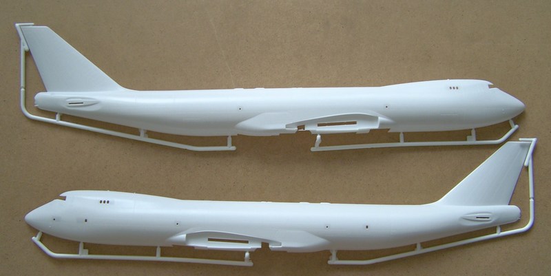 Der wesentlichste Unterschied liegt natürlich im kurzen Oberdeck und der Fensterkonstellation, die der eines Frachters entspricht. Aus Erfahrungen mit der Revell-747-8I sind Passgenauigkeit und Oberflächendetaillierung durchweg gut. Positiv fällt die Einzeldarstellung der Fanblades auf, die über Revell´s "normalen" Standard hinausgeht. Einen Wermutstropfen gibt es jedoch in der Formaufteilung der Einlaufschächte für die Triebwerke (wie auch bei Revell 747-8I!). Diese Längsteilung ist für den Anblick im fertigen Modell sehr störend. Die Fanblades sind sehr filigran und bilden optisch einen Fixpunkt des Modells. Ein einziges komplettes Bauteil als eine Art Trommel wäre die bessere Lösung gewesen.