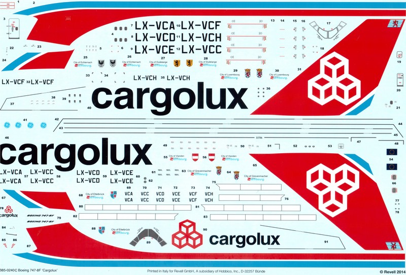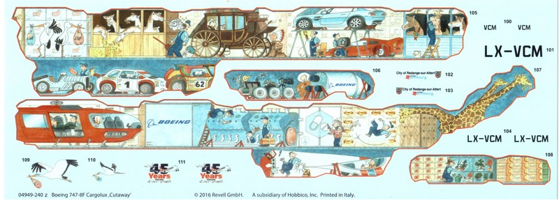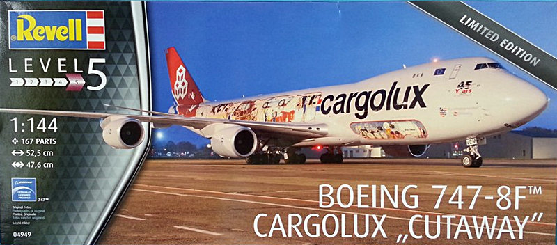 Modell: Revell hat nun den 747-8F Frachter in einer Limited Edition auf den Markt gebracht. Der Bausatz basiert auf dem weiterhin erhältlichen Kit, welcher hier von René vorgestellt wurde. Die Bezeichnung "Cutaway" bezieht sich dabei auf den Namen der Sonderlackierung und etwa nicht darauf, dass das Modell ein sichtbares Innenleben hat. Die Kunststoffteile sind dabei absolut identisch mit dem Kit 04885, neu sind der Stülpkarton im neuen Design, das farbige Bemalungsblatt und natürlich der ergänzende Decalbogen, welcher die Elemente der Sonderbemalung sowie die Kennung und den Taufnamen der Maschine enthält. Der originale Bogen der Erstausgabe wird weiterhin fast vollumfänglich verwendet.