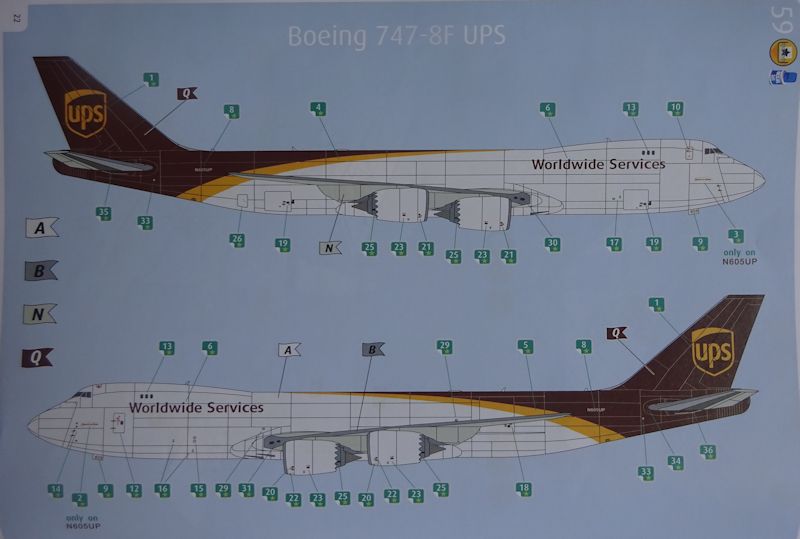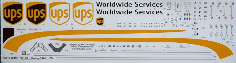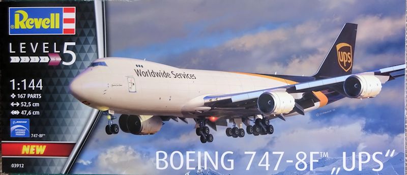 Bausatz: Revell hat nun den 747-8F Frachter erneut auf den Markt gebracht, diesmal in den Farben des Logistik- und Postunternehmens UPS (United Parcel Service of America). Die Kunststoffteile, identisch mit den älteren Bausätzen, befinden sich in einem Stülpkarton. Hinzu kommen Bauanleitung und Abziehbilder.