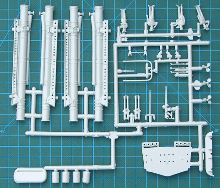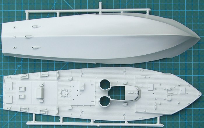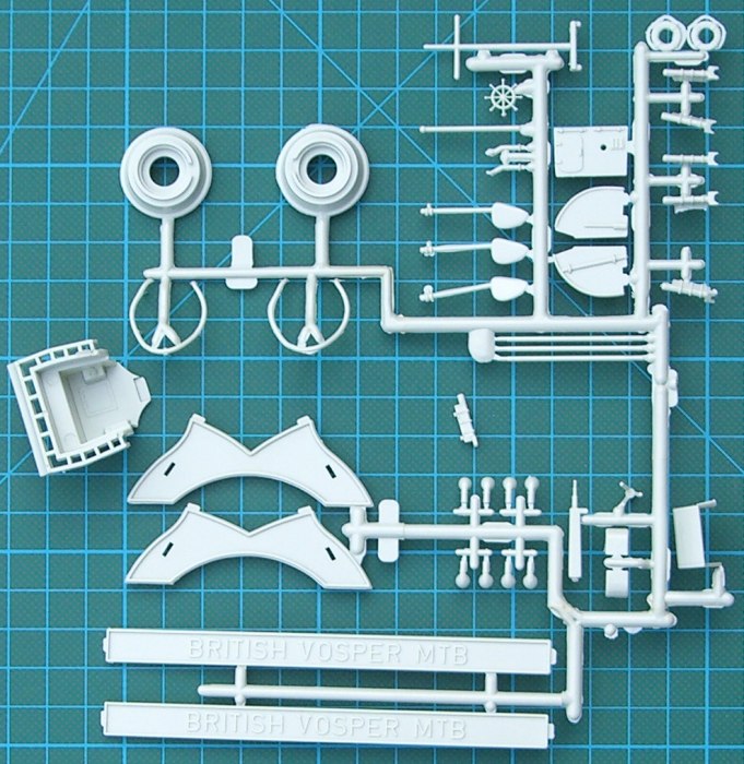 Der Bausatz besteht nicht aus Spritzgussrahmen wie man sie heute kennt. Die Qualität der Bauteile ist sicherlich nicht mit einem S-Boot von Revell vergleichbar. Die Detaillierung der Teile ist trotzdem ganz gut. Ich finde das gesamte Deck recht ansprechend. Es hat sogar eine vernünftige Holzstruktur. Mittels der beigefügten Kleinteile entsteht mit ein wenig Nacharbeit sicher ein ordentliches Modell. Zurüstteile von Kleinserienherstellern habe ich dafür nicht gefunden. Gut für den Modellbauer ist auch das komplexe Rumpfteil. Hier gibt es garantiert keine Probleme mit dem Verkleben oder Ausrichten. Die Decals und die Papierfahne sind ordentlich ohne Versatz gedruckt.