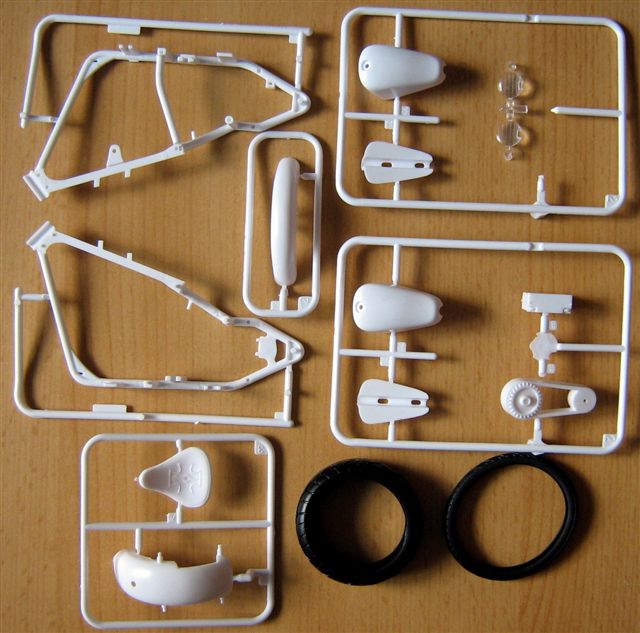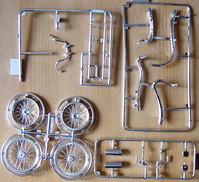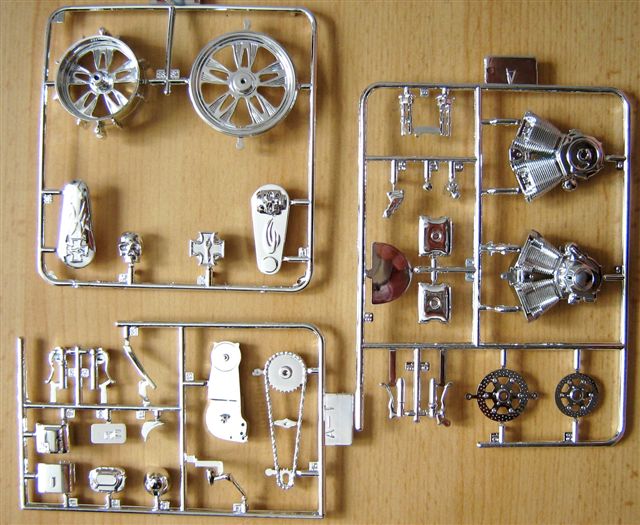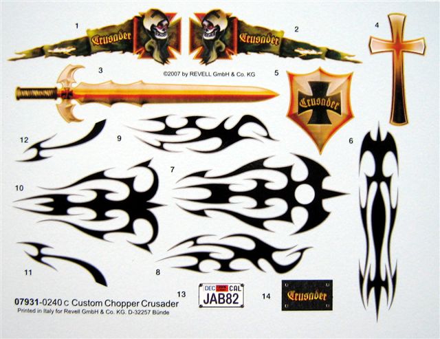 Der Bausatz bietet die Möglichkeit, das Modell in der Heck Chopper Ausführung wahlweise im Totenschädel- oder Eiserne-Kreuz-Design zu bauen oder Teile zu kombinieren, wie man es halt möchte.