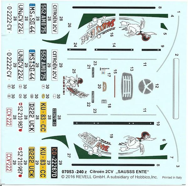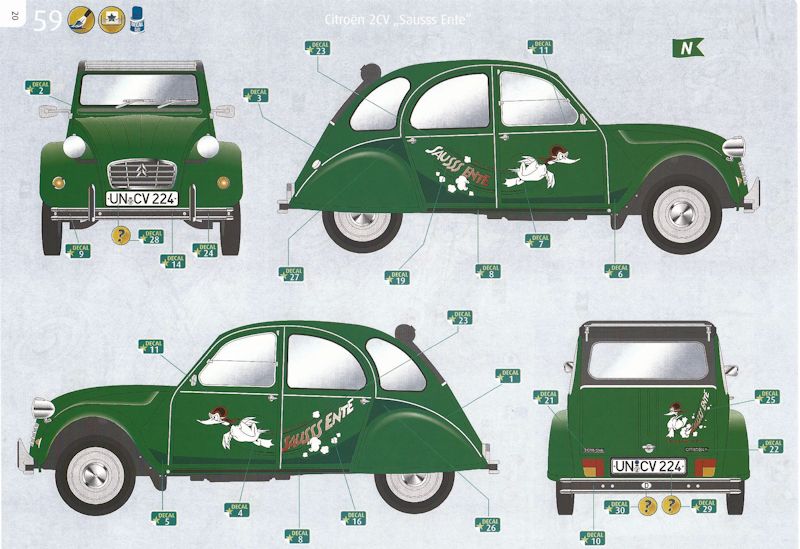 Ein sauberer und randscharf gedruckter Abziehbilderbogen mit diversen Kennzeichen (D, F, NL, B, CH, GB, I, E) und der speziellen ab 1987 erhältlichen "Sausss Ente" Dekoration liegt bei. Die Bemalungsanleitung bezieht sich auf das firmeneigene Farbensortiment.