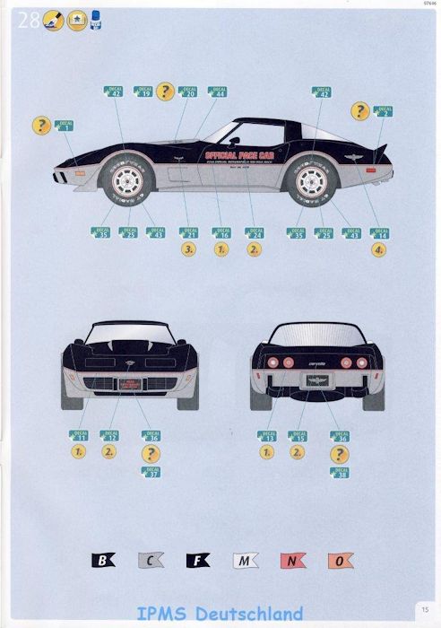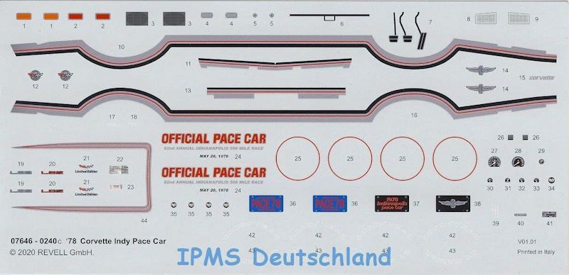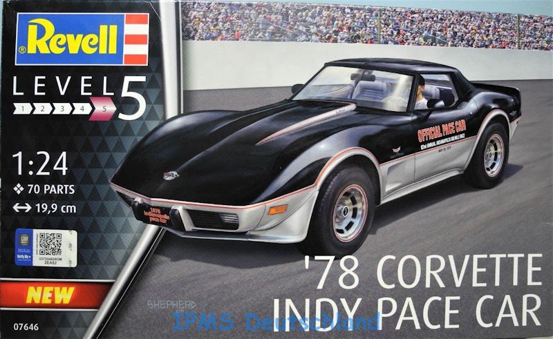 Bausatz: Als Automodellneuheit im Maßstab 1:24, bringt Revell das '78 Corvette Indy Pace Car, auf den hiesigen Modellbaumarkt. Die 78er Corvette ist eine Wiederauflage des alten Monogram Kits aus dem Jahr 1978. Ein gern gesehener guter alter "Bekannter" im Automodellbau, da es im Maßstab 1:24 nur das Monogram Modell gab. Nur MPC hatte noch eine 78er Indy Pace Car Corvette im Maßstab 1:25, in ihrem leider nicht mehr erhältlichen Programm.