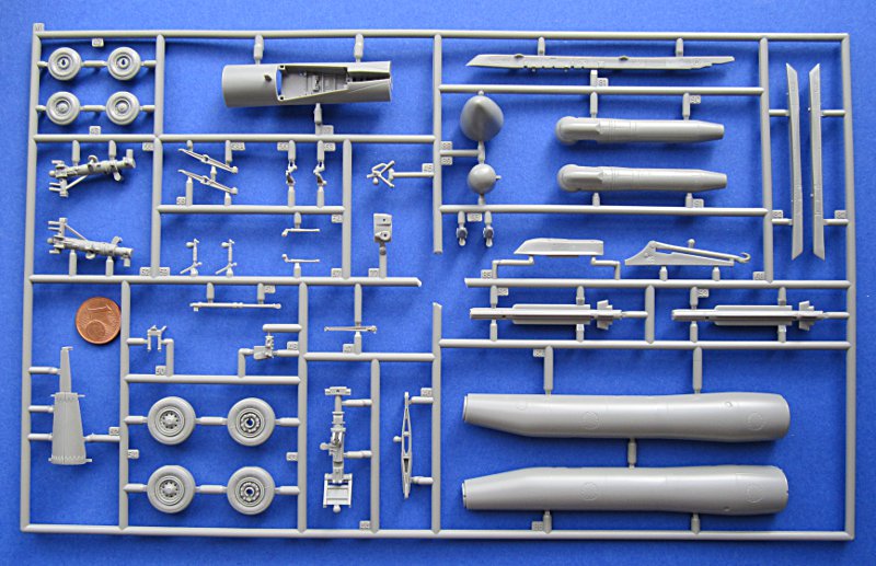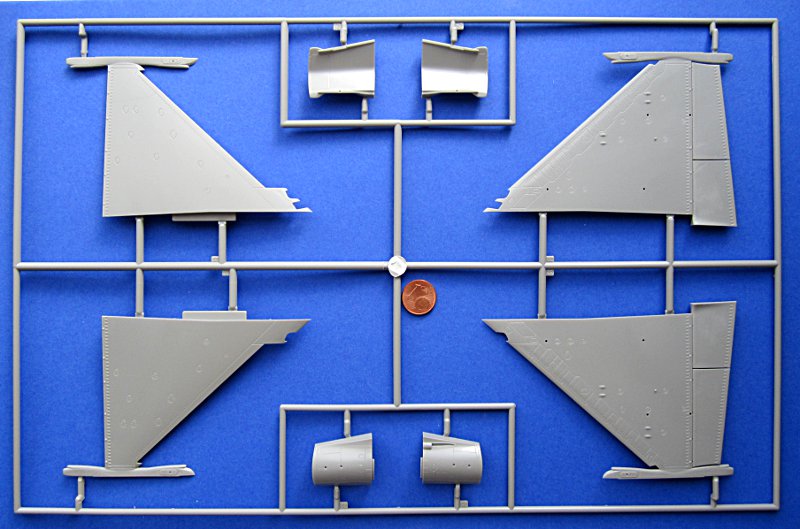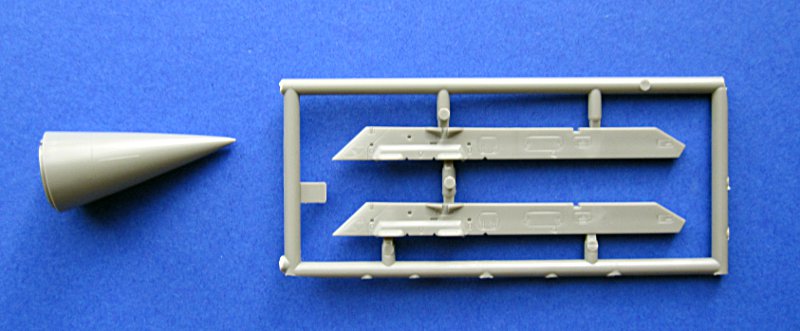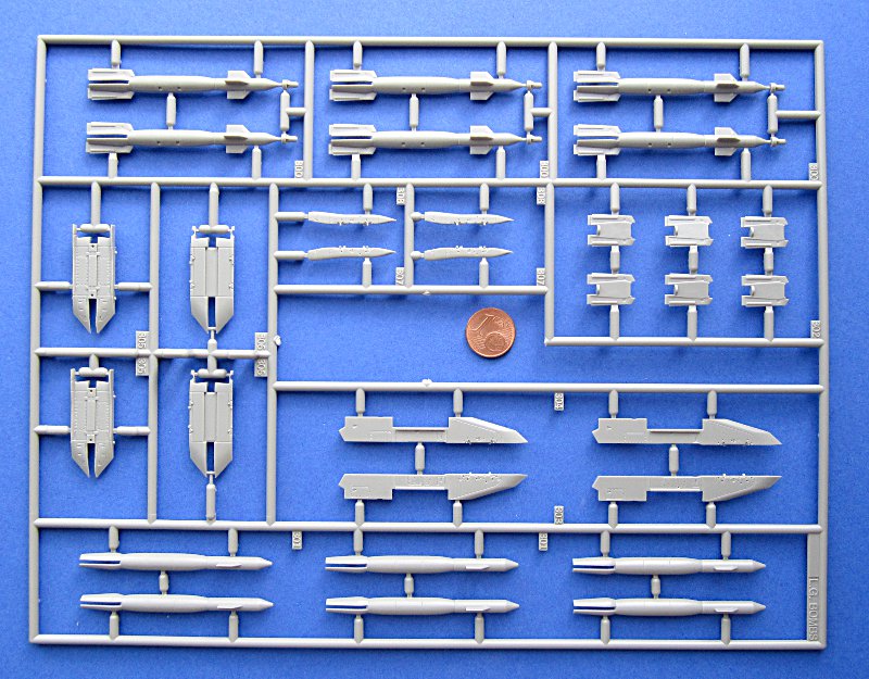 Dem Bausatz liegt der Spritzling für die GBU-12 einschließlich Dreifachträger für die Rafale bei. Mit zwei oder drei Highspeed-Tanks und MICA an den Flügelenden ist dies eine der möglichen Beladungen für den scharfen Einsatz in Nordafrika. Das Buch von Histoire & Collections zeigt leider nur Bilder von Rafale B und C der Armee de l'Air so dass ich bei der 3-Tank Konfiguration bei den Trägerflugzeugen nicht sicher bin.