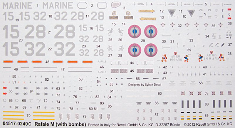 Neu sind die Abziehbilder für die Rafale M. Für deren Design zeichnet Sylvain Hautier verantwortlich, der sicher vielen durch seine Abziehbilder unter dem Syh@rt Label bekannt ist. Gedruckt wurden die Nassschiebebilder bei Cartograf in Italien, in bekannter, sehr guter Qualität. Aus meiner Sicht ist es schade, dass Revell die Decals mit einem Mattlack versehen lässt. Dies macht es schwieriger, den Trägerfilm zu kaschieren. 3 Bemalungsvarianten sind möglich: