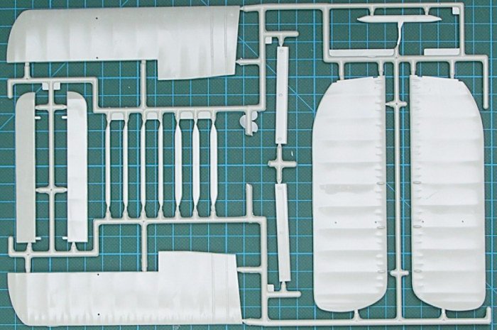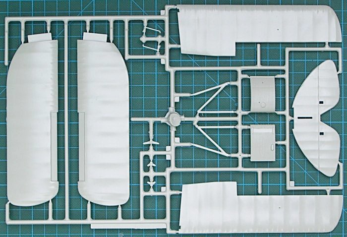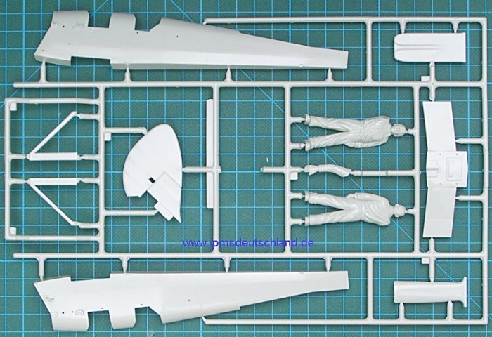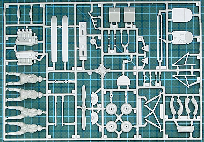 Nach dem Öffnen des großen Kartons kommen gut detaillierte Bauteile zum Vorschein. Schnell zeigt sich aber auch, dass das Cockpit den heutigen Ansprüchen nicht mehr genügen kann. Hier hilft entweder nachdetaillieren oder die beiden Pilotenfiguren einbauen, die gar nicht so schlecht aussehen. Es gibt auch für eine Wartungsszene einen Motor, der eingebaut wird und optional offen dargestellt werden kann. Die Stoffstruktur des Originals wurde sehr gut auf den Bausatz übertragen. Hier ist nichts übertrieben und es wirkt sehr maßstäblich. Für einige Steuerseile und die Verspannung gibt es einen schwarzen Bindfaden, dieser oder die Alternativfaden müssen rechtzeitig eingeführt werden, da man nach dem Ende der Arbeiten nur schwer an einige Stellen herankommt.