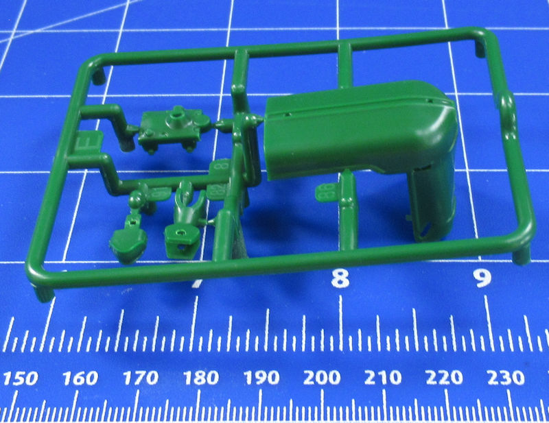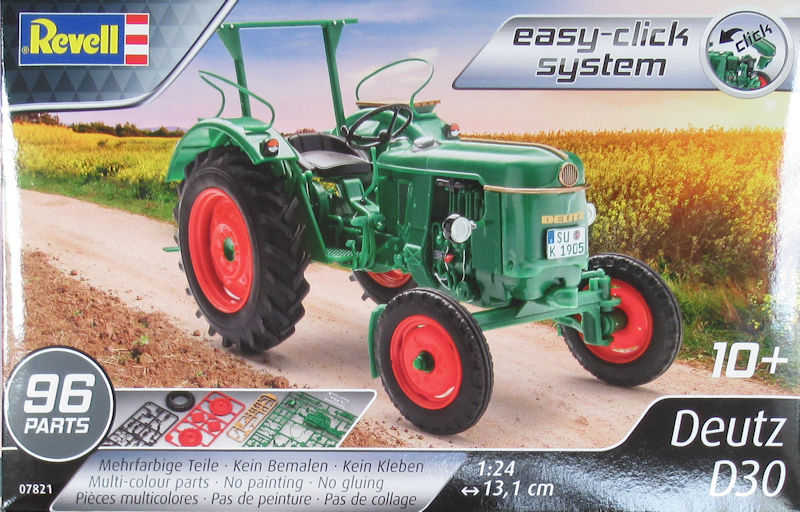 Bausatz: Inzwischen erfreuen sich Traktorbausätze auch im Maßstab 1/24 einer gewissen Beliebtheit. Durch diesen Maßstab sind sie auch für Anfänger sehr gut zu bauen. Der Deutz D30 soll fertig ca. 13 Zentimeter lang sein. In der attraktiven aber unpraktischen Schüttbox befinden sich sehr gut verpackt drei grüne Spritzgussrahmen mit 70 Teilen, ein roter Spritzgussrahmen mit vier Teilen, ein schwarzer Rahmen mit zwölf Teilen sowie ein goldener Rahmen mit sieben Teilen, vier Gummireifen, ein Bogen mit Sticker sowie einer mit Decals und die übersichtliche Bau- und Bemalungsanleitung.