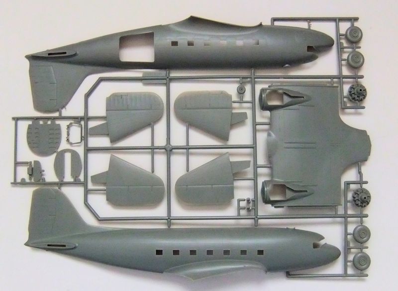Nur 118 Bauteile bei so einem großen Flugzeugmodell? Na ja, das war aber damals die Stärke der Bausätze der Firma Monogram in ihren besten Jahren. Viele schöne Details, gestaltet an relativ wenigen Bauteilen. Diese sind durchaus auch an der AC-47 zu finden. Besonders das Innere, bestehend aus einem schönen Cockpit und der kompletten Anlage der Waffenstände, kann auch nach heutigen Maßstäben überzeugen. Eventuell sollte man die Fenster von ihren Platten trennen und diese einzeln einsetzten. Auch könnte die dick aufgeprägte vordere Einstiegstür entfernt und durch ein geöffnetes Gegenstück ersetzt werden. Somit wäre auch noch der Arbeitsplatz des Funkers sichtbar. Auch mit der oberen Notausstiegsklappe über dem Cockpit könnte man so verfahren. Über den zum Glück stabilen Rumpfhalbschalen und den Tragflächen ziehen sich die damals üblichen erhabenen Gravuren. Profis werden diese sicher nachgravieren.