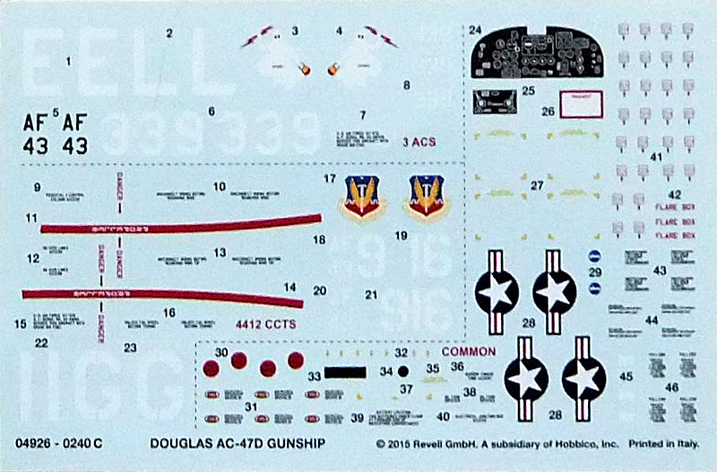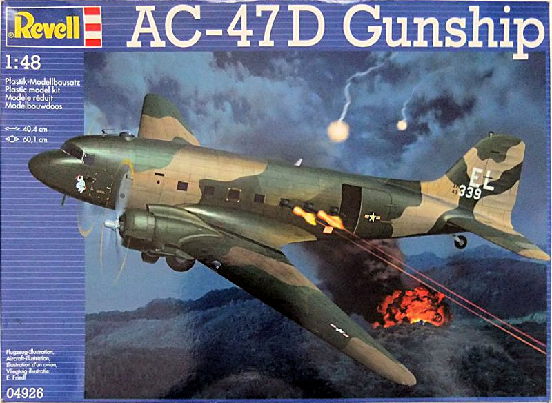 Bemalungen: Revell hat zwei Varianten für die Kennungen vorgesehen. Einmal ein Gunship-Flugzeug einer Einheit, welche 1968 auf der Basis Nha-Trang Südvietnam stationiert war und eine AC-47D einer Trainingseinheit aus Florida. Beide Maschinen bekommen den sogenannten Süd-Ost-Asien-Anstrich.