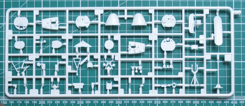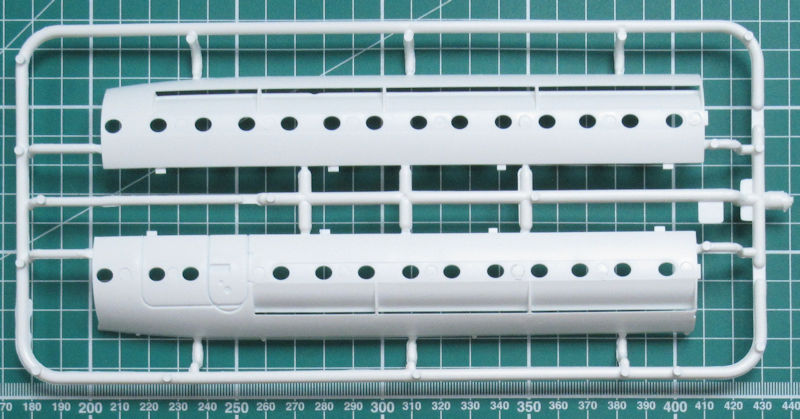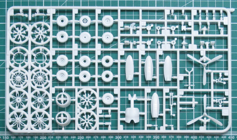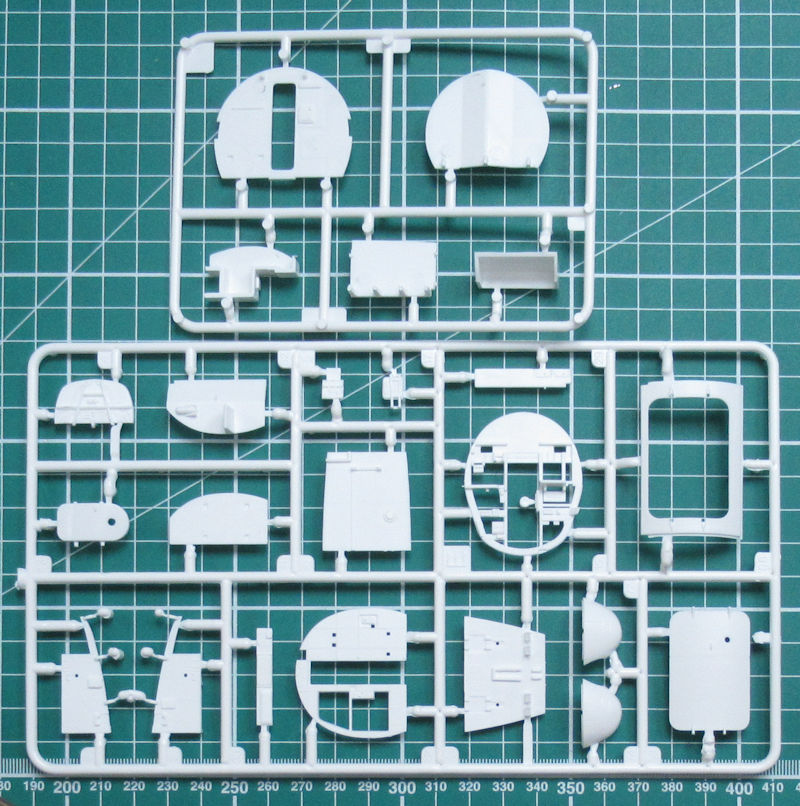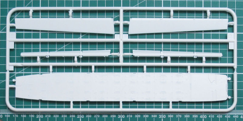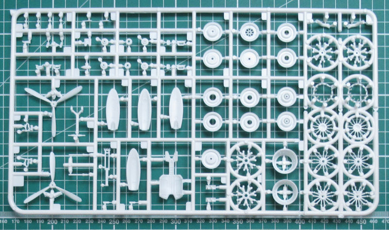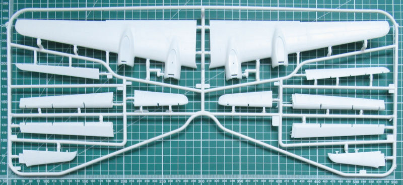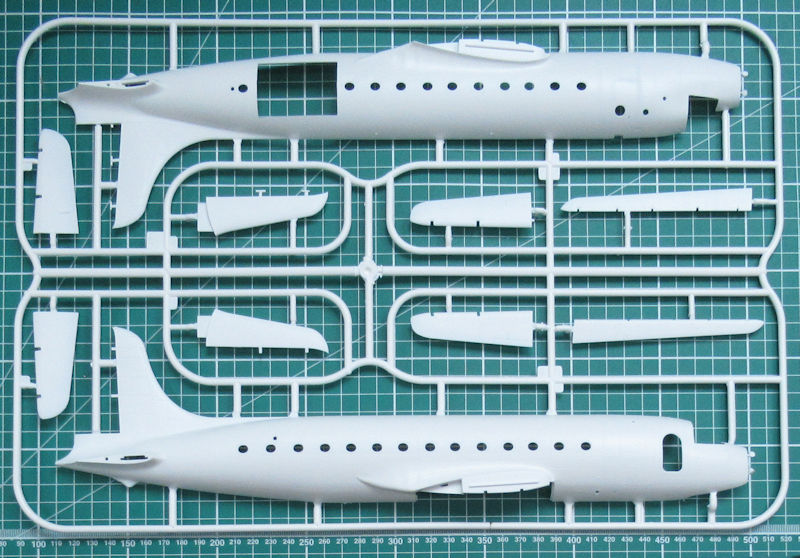 In dem attraktiven aber etwas zu wabbeligen Stülpkarton befinden sich sehr gut verpackt 14 weiße Spritzgussrahmen mit 330 Teilen, einen Klarsichtrahmen mit 22 Teilen. In einem separaten Karton befinden sich noch folgende eduard-Detailsets: SS529, 73530 und 72605. Ein paar Revell-Teile sind auch für die DC-4 ausgelegt und wandern in die Restekiste. Der Rumpfboden ist clever ausgelegt. Auf der Rückseite ist er dann für die DC-4 benutzbar oder für diese C-54D.