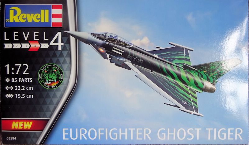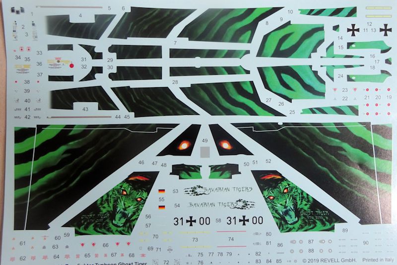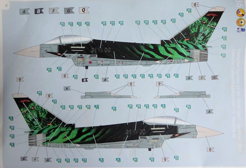 Bausatz: Dies ist die dritte Auflage des 2016er Eurofighters. In der bunten Faltschachtel finden wir 85 Teile an vier grauen und einem Klarsichtast. Alles ist sauber gespritzt und graviert. Das Level wurde auf 4 angehoben. Wegen der großflächigen Abziehbilder?