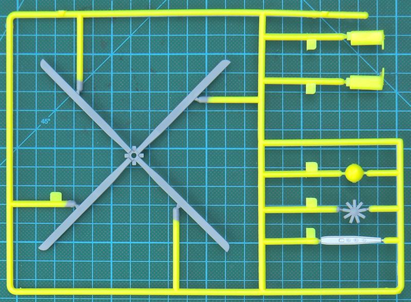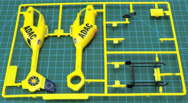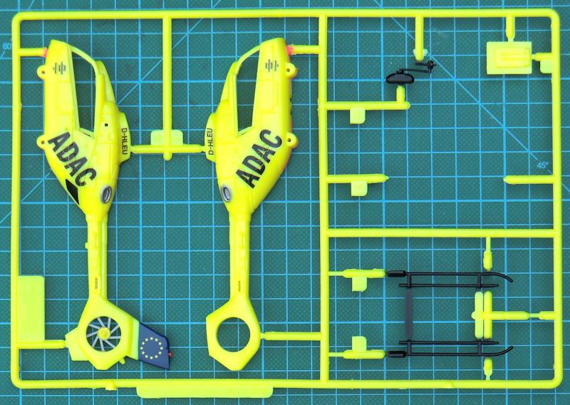 Der Bausatz ist im Prinzip identisch mit der Polizei-Variante, die es in der Vergangenheit schon für diese Aktion gab. Es gibt 14 bemalte Einzelteile. Das Cockpit ist aus einem Stück und mit zwei Piloten versehen. Das Ganze ist natürlich bemalt. Der Zusammenbau ist recht einfach und alles passt ohne Probleme zusammen. Ein Highlight ist das bemalte Glasteil. Das wird einfach von außen in den Rumpf geschoben. Auch der Ausgleichsrotor wird von außen eingeklickt. So wird auch bei den Kufen, der Winde und Steuerflächen am Heck vorgegangen.