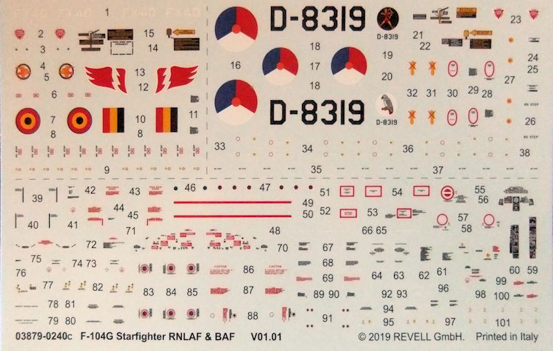Bemalung: Der Decalbogen ist klein, aber reichhaltig mit den vielen Wartungshinweisen für eine von zwei Maschinen. Am attraktivsten dürfte wohl der Starfighter der belgischen Luftwaffe sein. Mit seinem Anstrich, welcher der Südostasien Tarnung der Amerikaner entspricht. Dazu kommen noch die Außentanks in orange. Stationiert war der Jet 1981 in Beauvechain Belgien. Als zweites ist ein Starfighter der königlich niederländischen Luftwaffe vorgesehen, stationiert in Leeuwarden 1980. Die Tarnung ist Dunkelseegrau und Nato-Oliv. Unterseitig in grau.