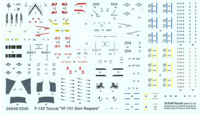 Bausatz: Passend zum Abschied der F-14 aus dem aktiven Dienst bei der US Navy hat Revell den 144er Bausatz der F-14D Super Tomcat herausgebracht. Die Spritzgussteile stammen aus Korea. Sie sind fein graviert. Es gibt ein richtiges Cockpit. Das wird mittels Decals aufgewertet. Die Tragflächen können beweglich montiert werden. Leider kann die Kanzel nur geschlossen montiert werden. Das ist aber bei diesem Maßstab nicht anders zu machen. Als Höhepunkt möchte ich den Decalsatz bezeichnen, der in Zusammenarbeit mit DACO erstellt wurde.