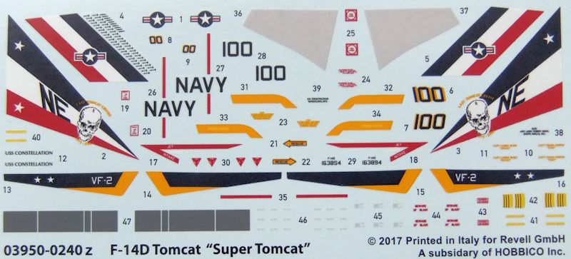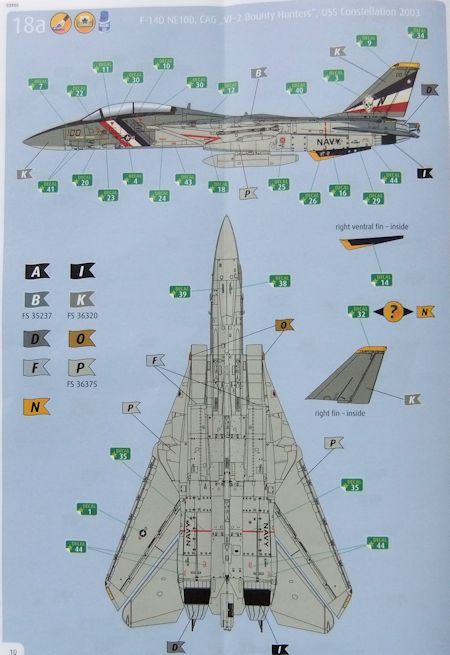 Bemalung: Der kleine Decalbogen beinhaltet alle Embleme, die für die von Revell vorsehende Variante gebraucht werden. Es ist eine Maschine der "Bounty Hunters" auf dem Flugzeugträger U.S.S. Constellation aus dem Jahre 2003.