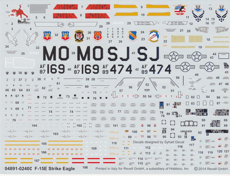 Dem Bausatz liegt ein neuer Gußast mit zwei GBU-15 TV/IR lasergelenkte Bomben, zwei GBU-10 Bomben, zwei AIM -120B AMRAAM und ein Data Link Pod bei. Man hätte sich auch zwei AIM-9X Sidewinder gewünscht, die die AIM 9L Sidewinder schon fast aus dem Bestand der US Air Force verdrängt hat. Verwendet man die AIM-120 AMRAAM am Model sollten die LAU-114 gegen LAU-128 Starter getauscht werden. Hier wird man auf dem Zubehörmarkt fündig. Wer eine späte F-15 E baut sollte auch auf die veränderten Antennen achten. Auch hier kann der Zubehörhandel Abhilfe schaffen. Die Din A4-Bauanleitung umfasst 16 Seiten. Sie ist selbsterklärend und auch der noch nicht so versierte Modellbauer, wird hier vor keine großen Schwierigkeiten gestellt.